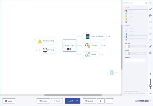 By default, maps open in Standard View, which allows you to expand and collapse the branches of the map, and focus on a particular topic with one click. When you hover on a map item or the various controls in the window, tooltips inform you of the features under your pointer. Notes, links, and other information displays in a sliding pane on the right.